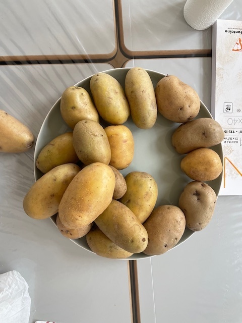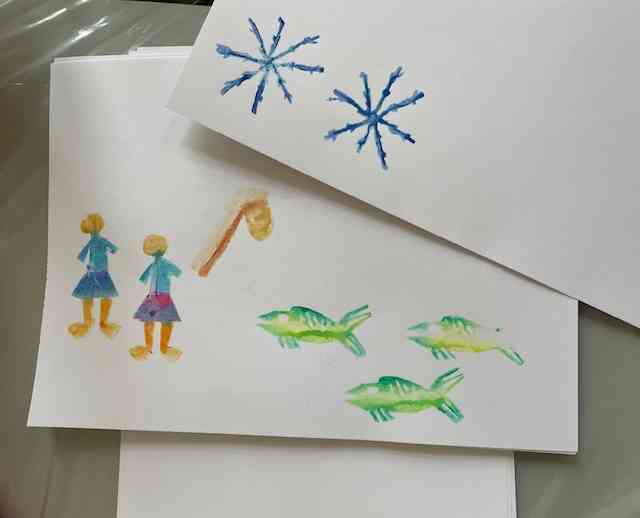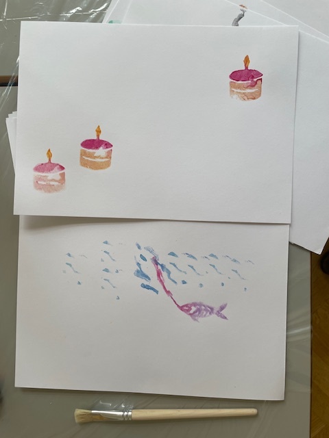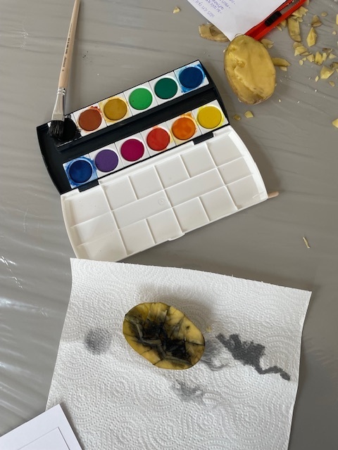 Anschließend begannen wir Kartoffeldrucke mit der Aufgabenstellung, eine Kindheitserinnerung abzubilden. Die Technik des Kartoffeldrucks ist sehr einfach und darauf ausgelegt, dass sie von jedem ausprobiert werden kann, ohne zu sehr auf Perfektion zu achten. Nachdem wir unser Motiv in die aufgeschnittene Kartoffel geschnitzt hatten, konnten wir dieses anmalen und auf Papier übertragen. Anschließend präsentierten wir unsere Arbeiten vor der Gruppe und stellten dazu Fragen.