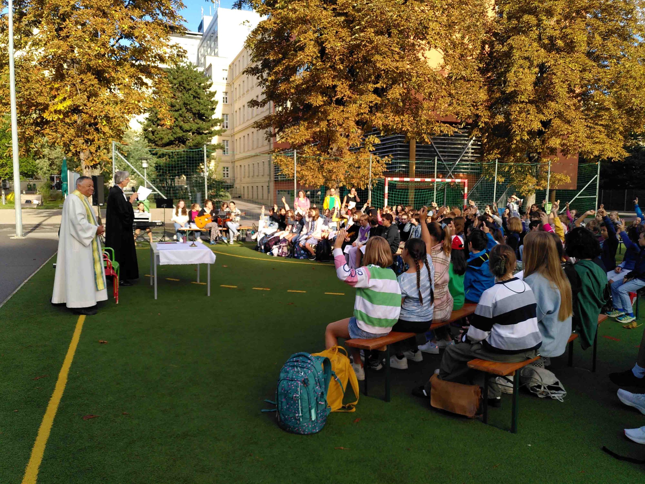 Er stand ganz unter dem Motto „Brücken bauen“: Brücken über Vorurteile, Missverständnisse, Konflikte und unterschiedliche Meinungen. Pater Hermann nannte in der Predigt drei „Zauberworte“, die beim Brückenbauen zwischen Menschen hilfreich sind: „Bitte“, „Danke“ und „Entschuldigung“. Danach überlegten die Kinder und Jugendlichen selbst, wie sie Gräben zwischen Menschen überwinden und Brücken bauen können. Schülerinnen der 8c sorgten durch ihre musikalische Gestaltung für einen feierlichen Rahmen. Herzlichen Dank dafür! Am Ende bauten die älteren Schüler:innen für die Kinder aus der 1. Klasse kleine Brücken und hießen sie so in unserer Schule ganz herzlich willkommen.