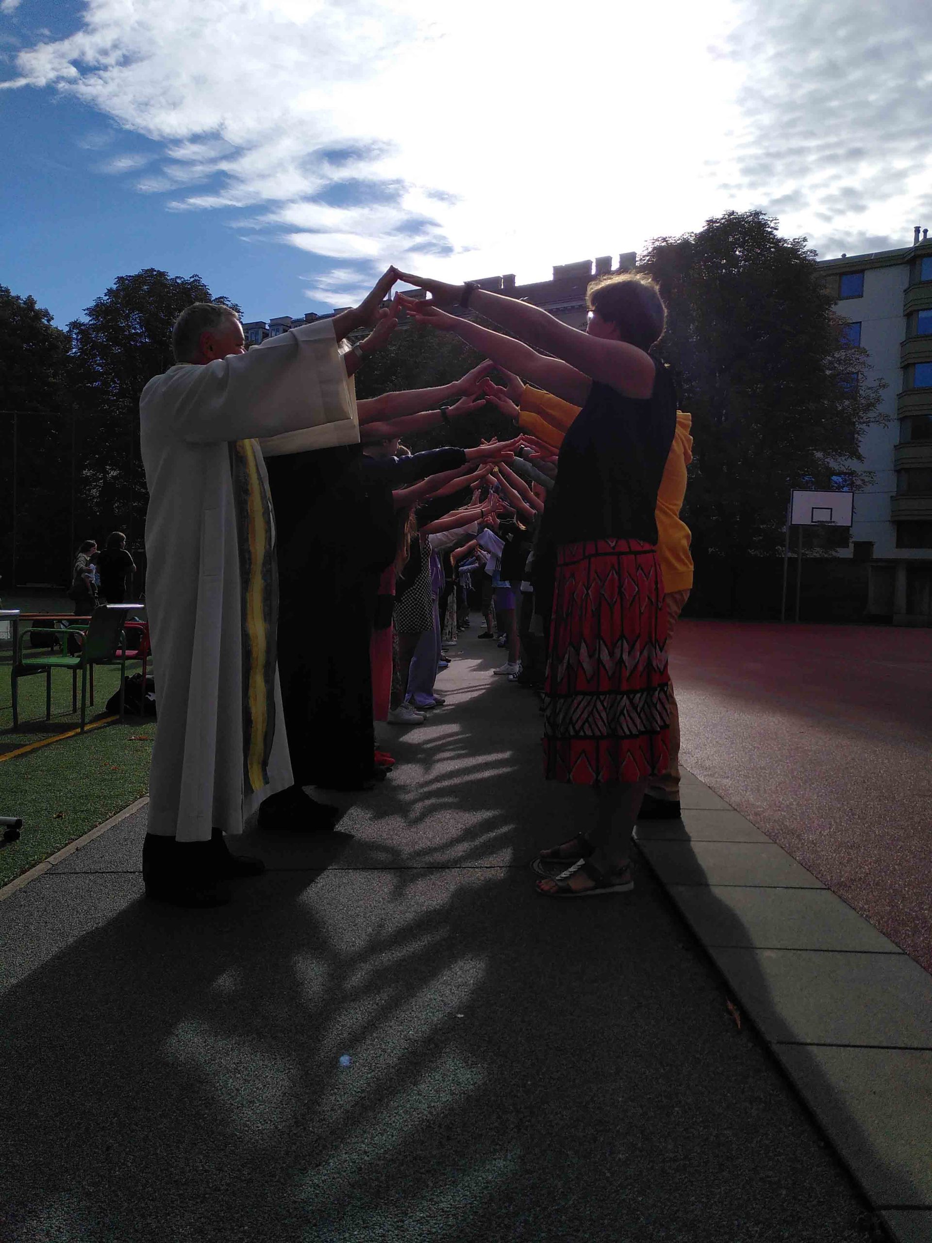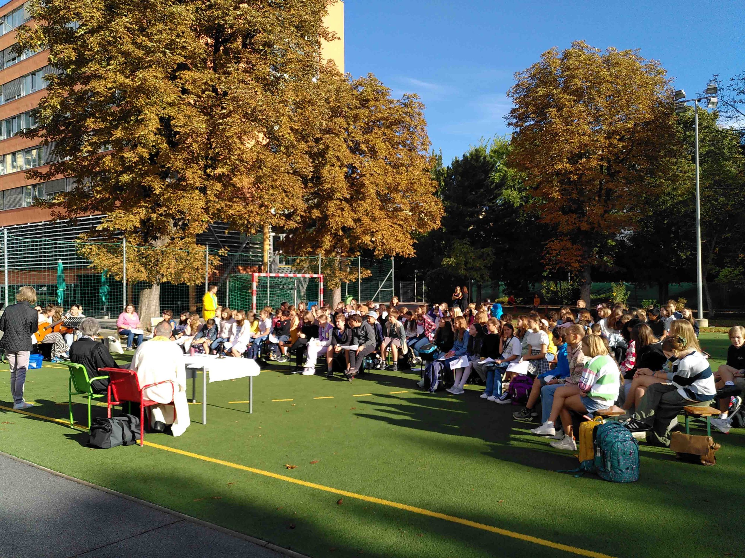 Eröffnungsgottesdienst am Sportplatz der Schule.