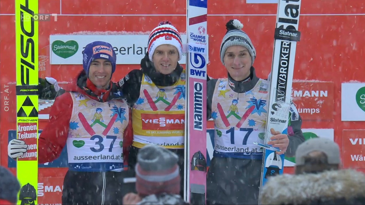 Die ganze internationale Elite der Skispringer trug Siris Startnummerndesign. Hier die drei Erstplatzierten Halver Einer Granerur, Stefan Kraft und Domen Prevc bei der Siegerehrung nach dem Springen am 28.1.2023:
