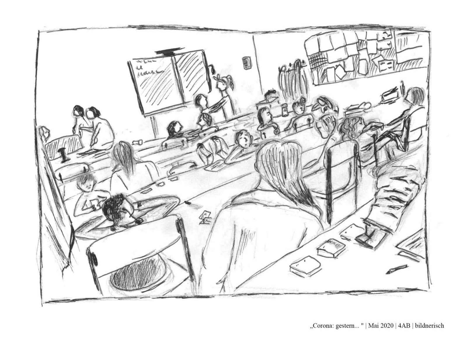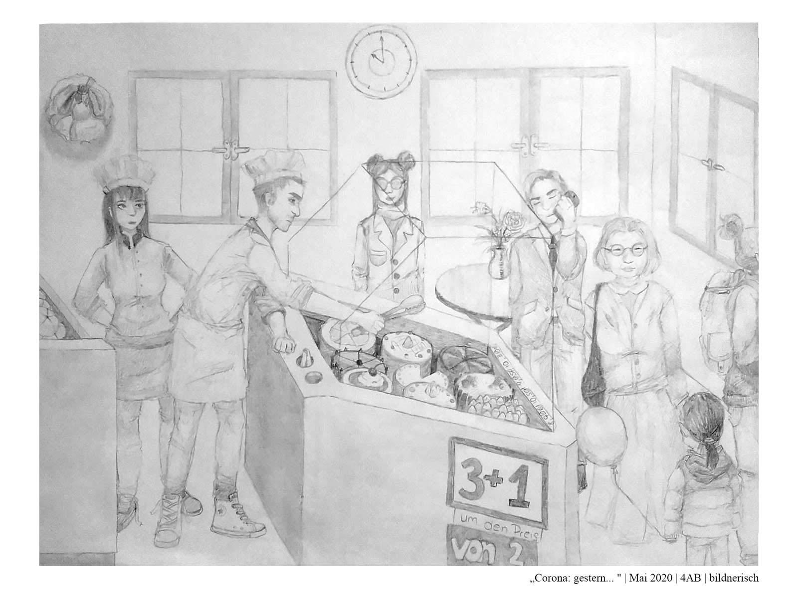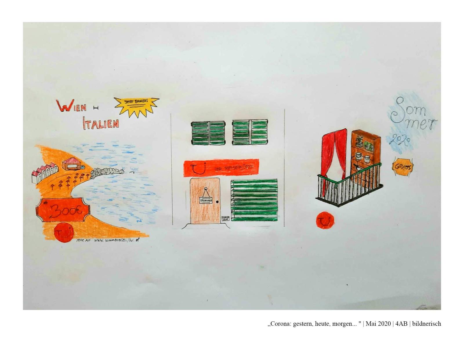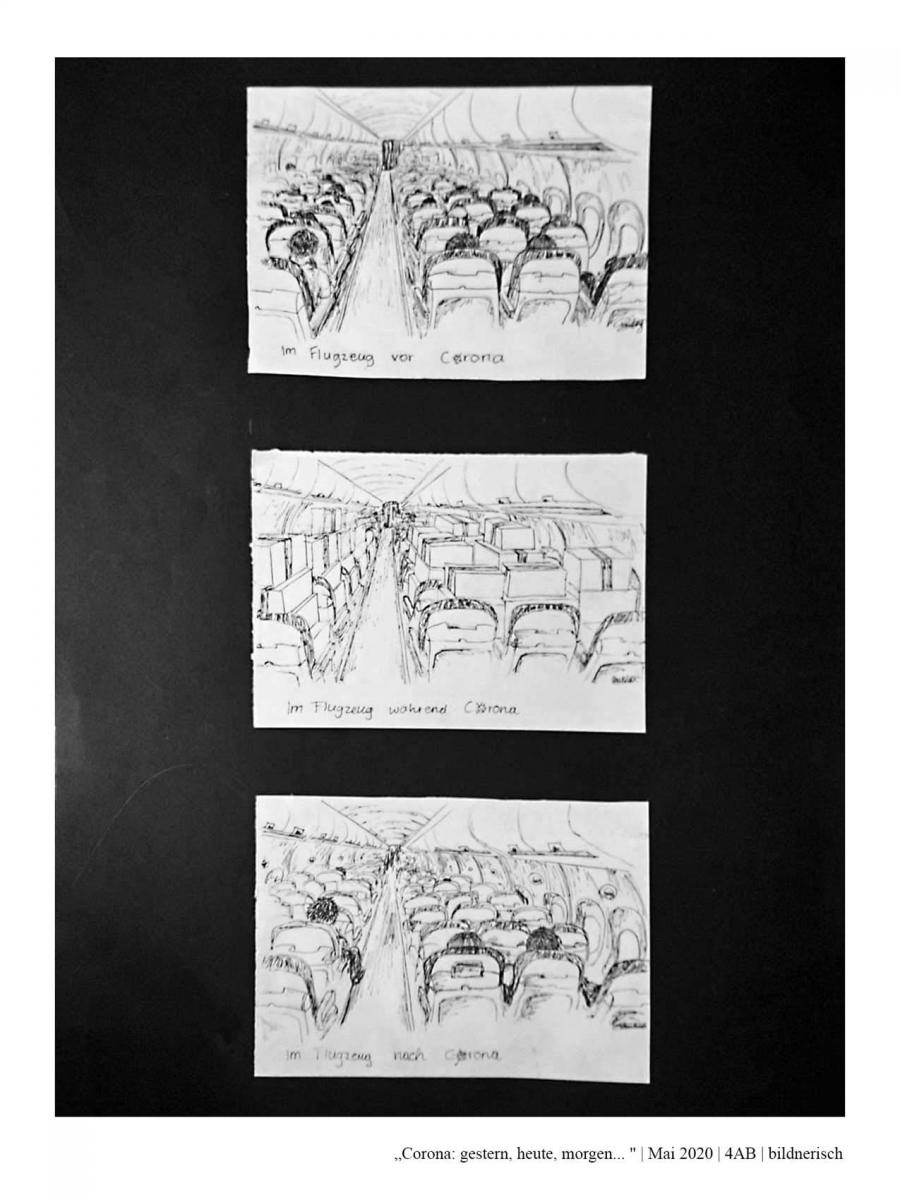 Die Schüler*innen der 4AB haben sich während des Lockdowns im Frühjahr 2020 mit dem aktuellen Zeitgeschehen auseinandergesetzt. Dabei haben sie sich folgende Fragen gestellt: Wie hat unser Alltag noch bis vor Kurzem ausgesehen? Was hat sich durch den Lockdown verändert? Wie könnte unser Alltag in Zukunft aussehen? Was wird trotz allem gleich bleiben? Wie könnte es weitergehen? Zur Zeit: Gestern, heute, morgen…