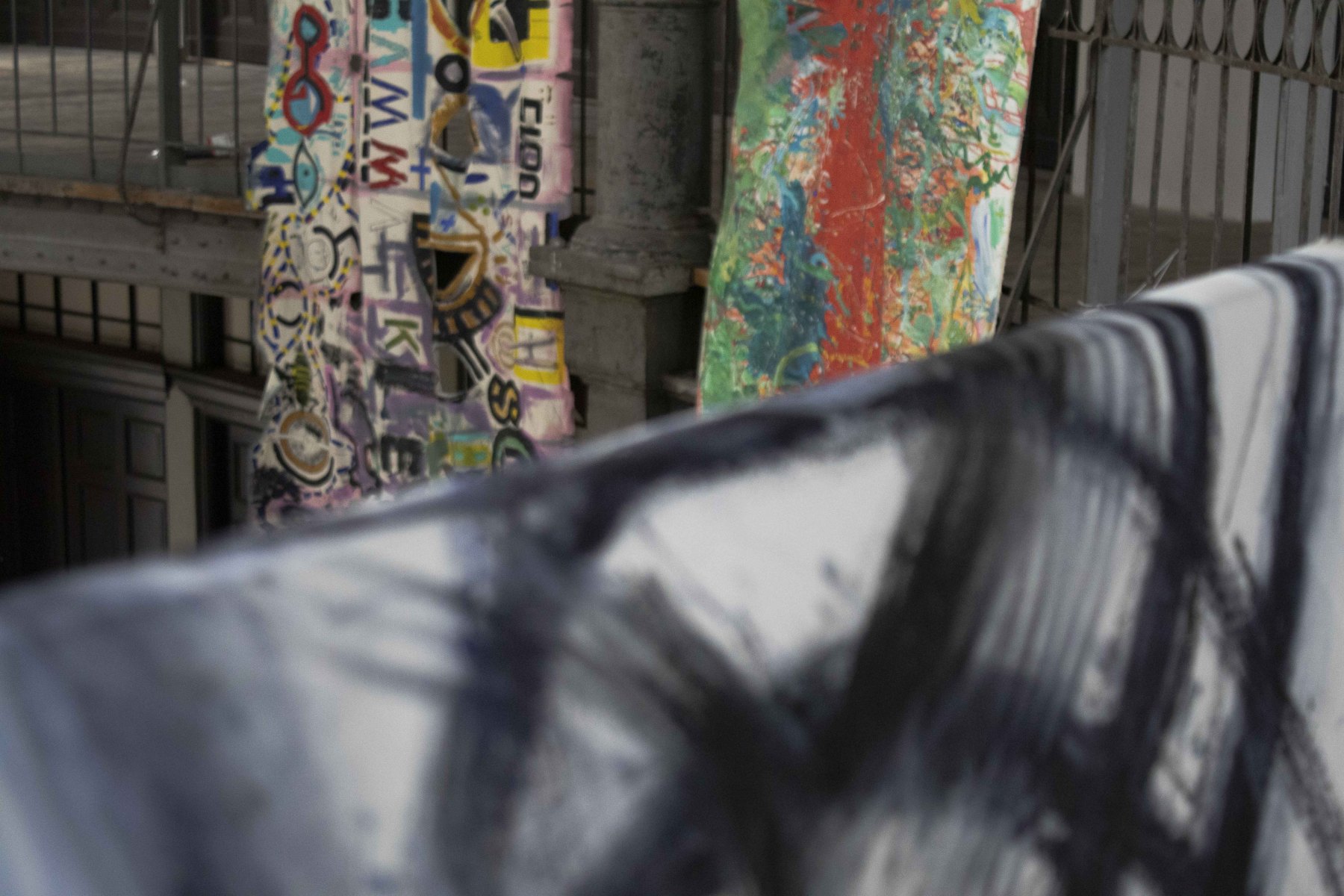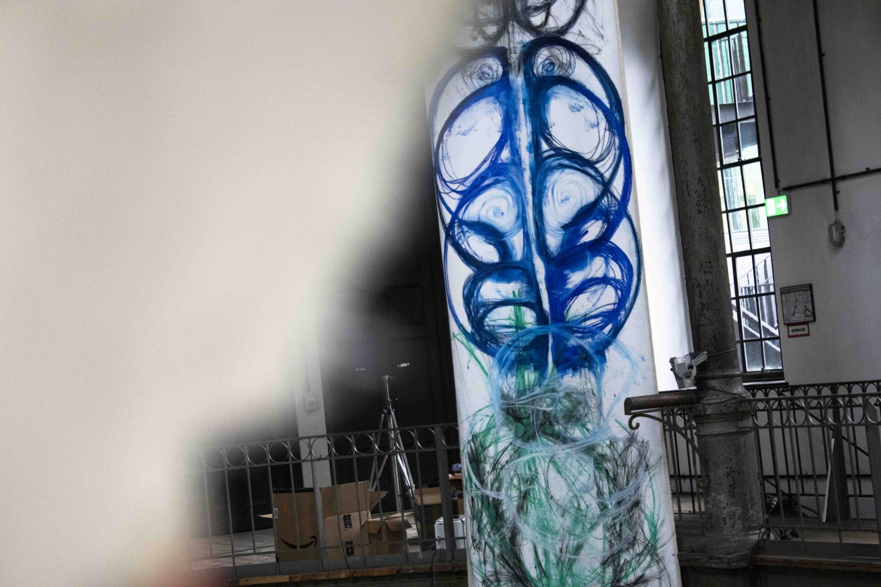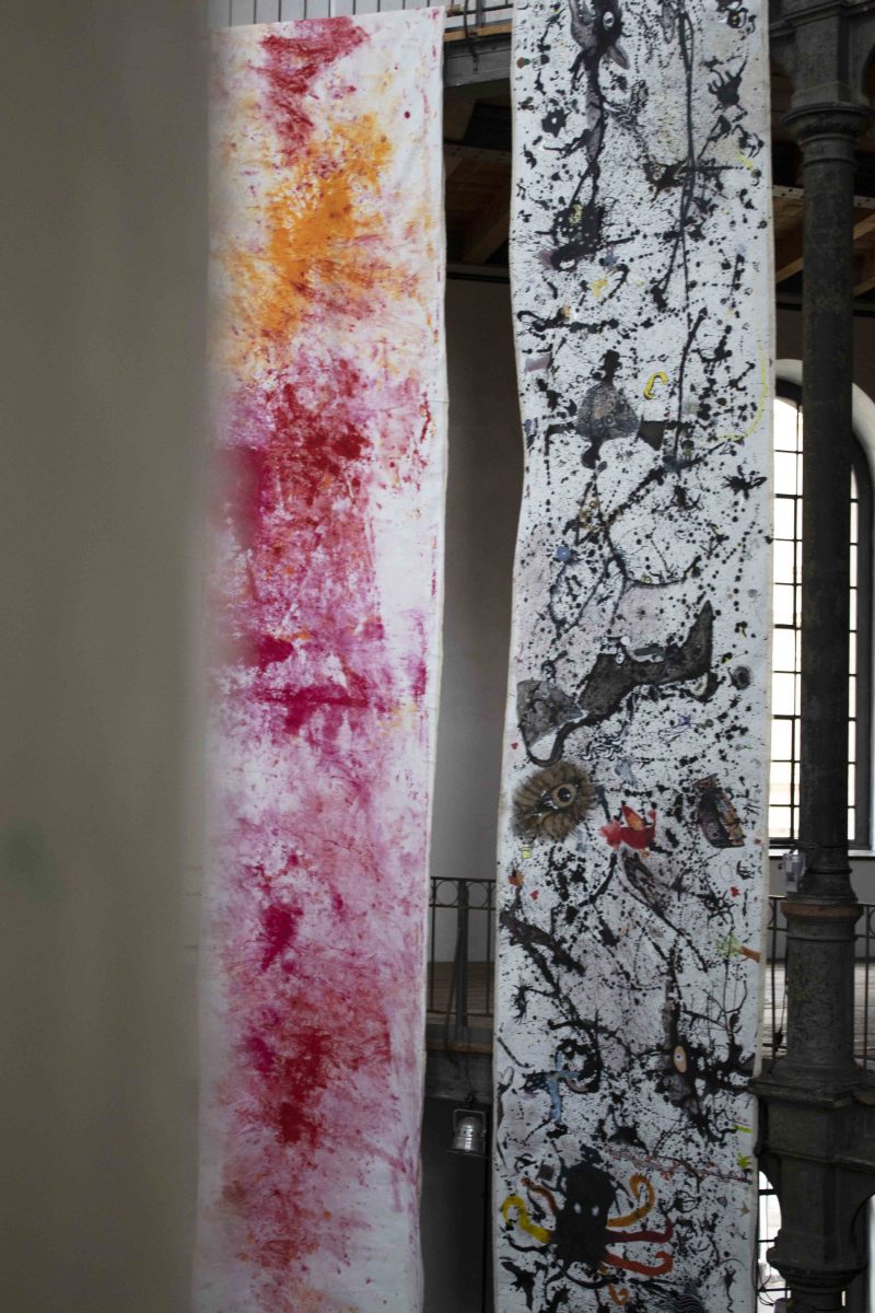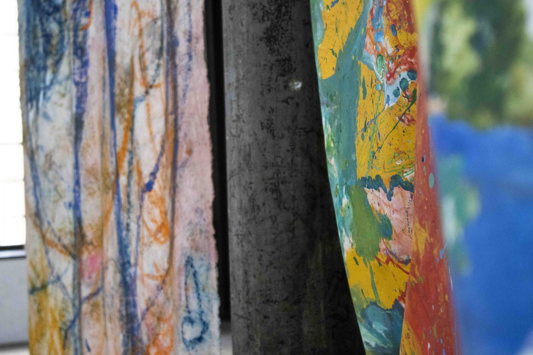 Farbmasse, vielleicht so dick wie Joghurt; Stifte, die den Klecks lebendig werden lassen; Ölkreide, deren Pigmente das Papier verlassen; Linien, die trennen und zusammenfassen; Drucke, die Form und Nichtform wiederholen; die Kraft der Kunstaktion, selbst ohne Worte spürbar. Unterschiedliche Materialien und Techniken – reichliche Spuren der Kunst auf neun Leinwandbahnen.