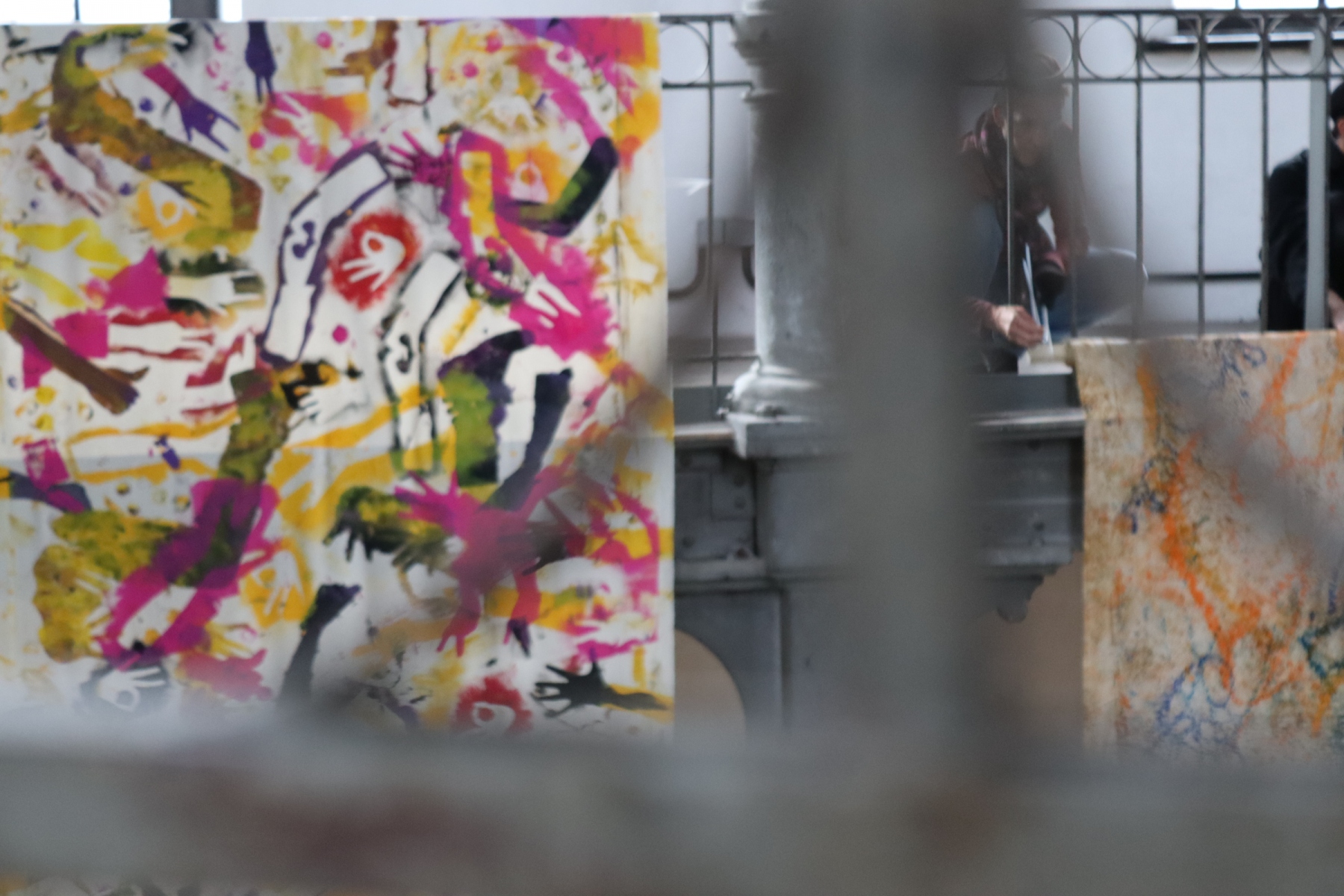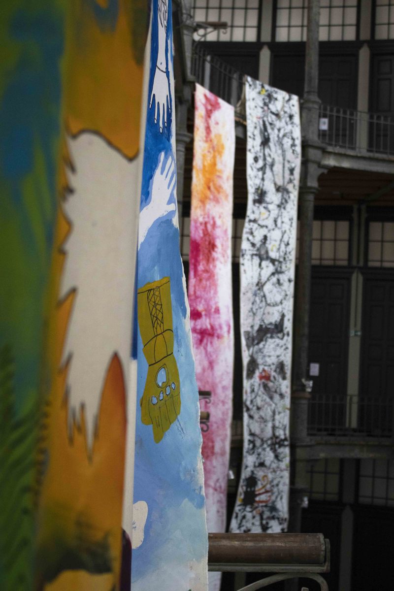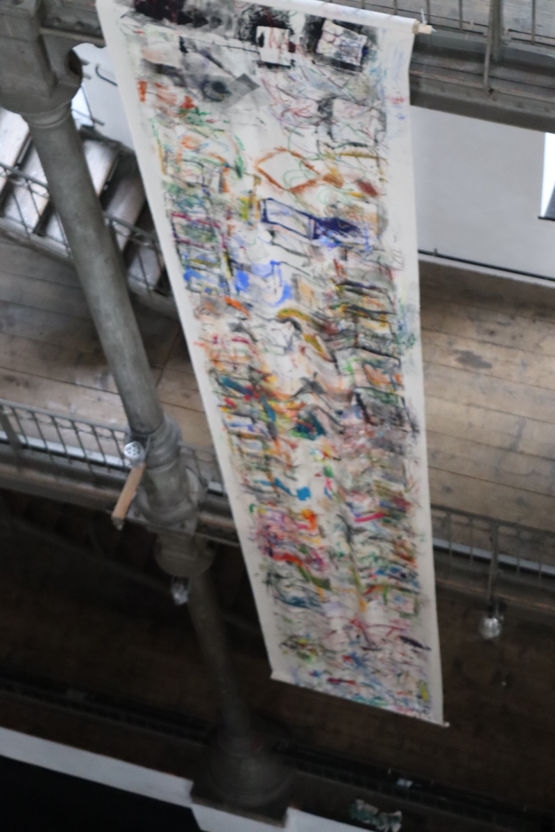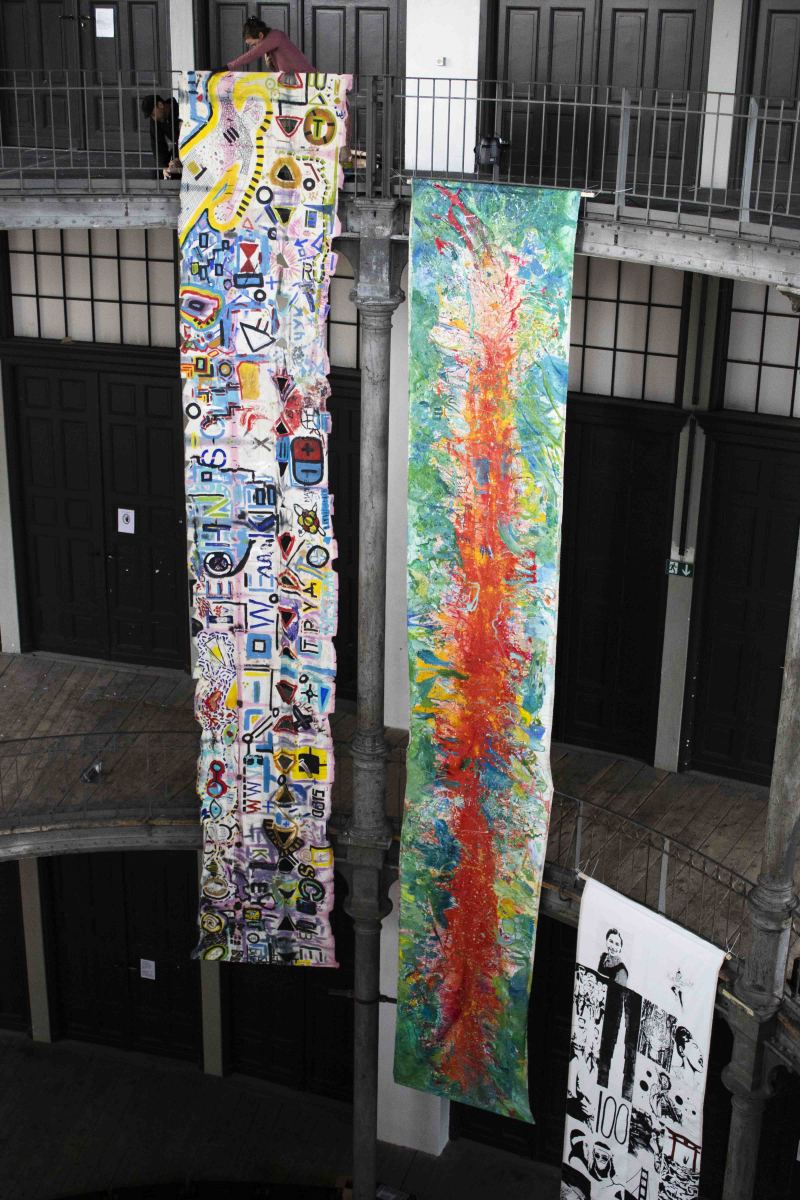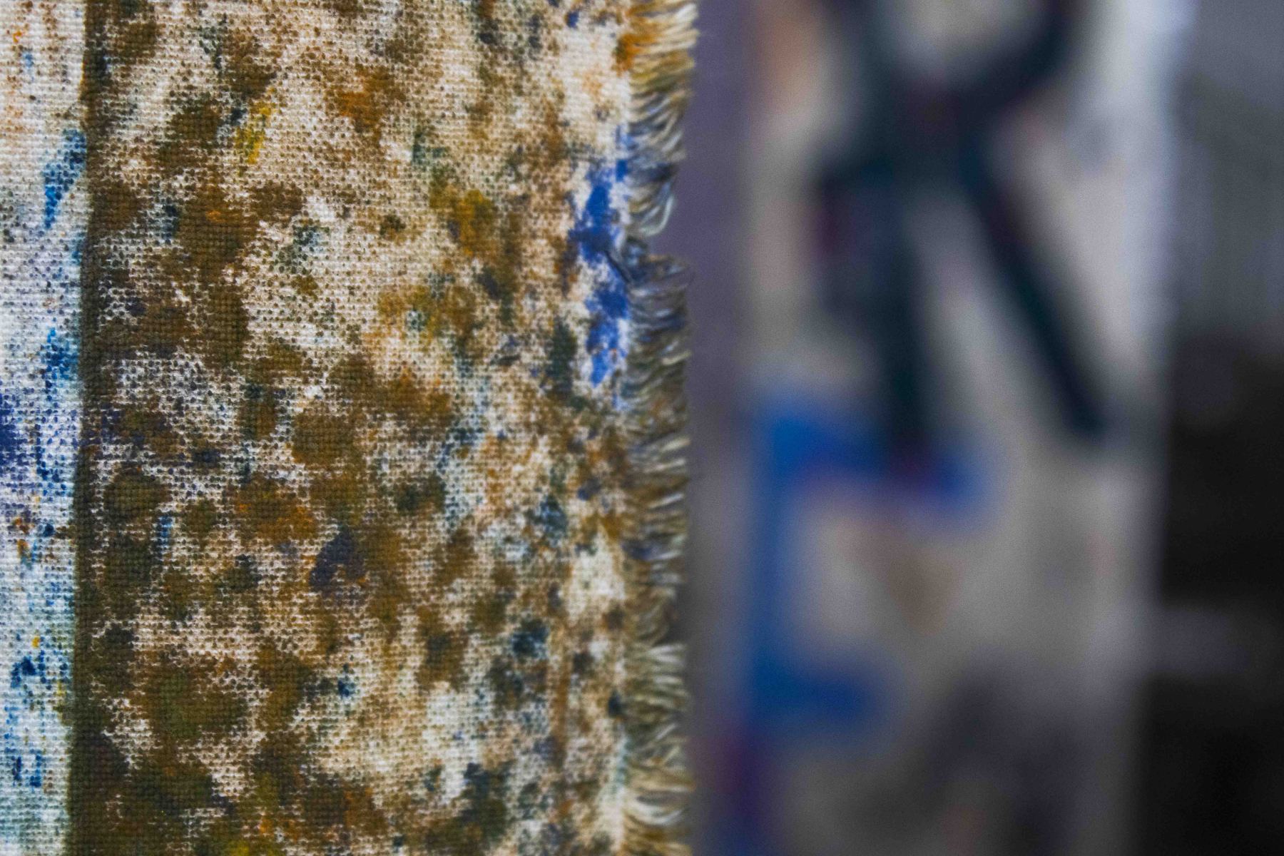 Farbmasse, vielleicht so dick wie Joghurt; Stifte, die den Klecks lebendig werden lassen; Ölkreide, deren Pigmente das Papier verlassen; Linien, die trennen und zusammenfassen; Drucke, die Form und Nichtform wiederholen; die Kraft der Kunstaktion, selbst ohne Worte spürbar. Unterschiedliche Materialien und Techniken – reichliche Spuren der Kunst auf neun Leinwandbahnen.