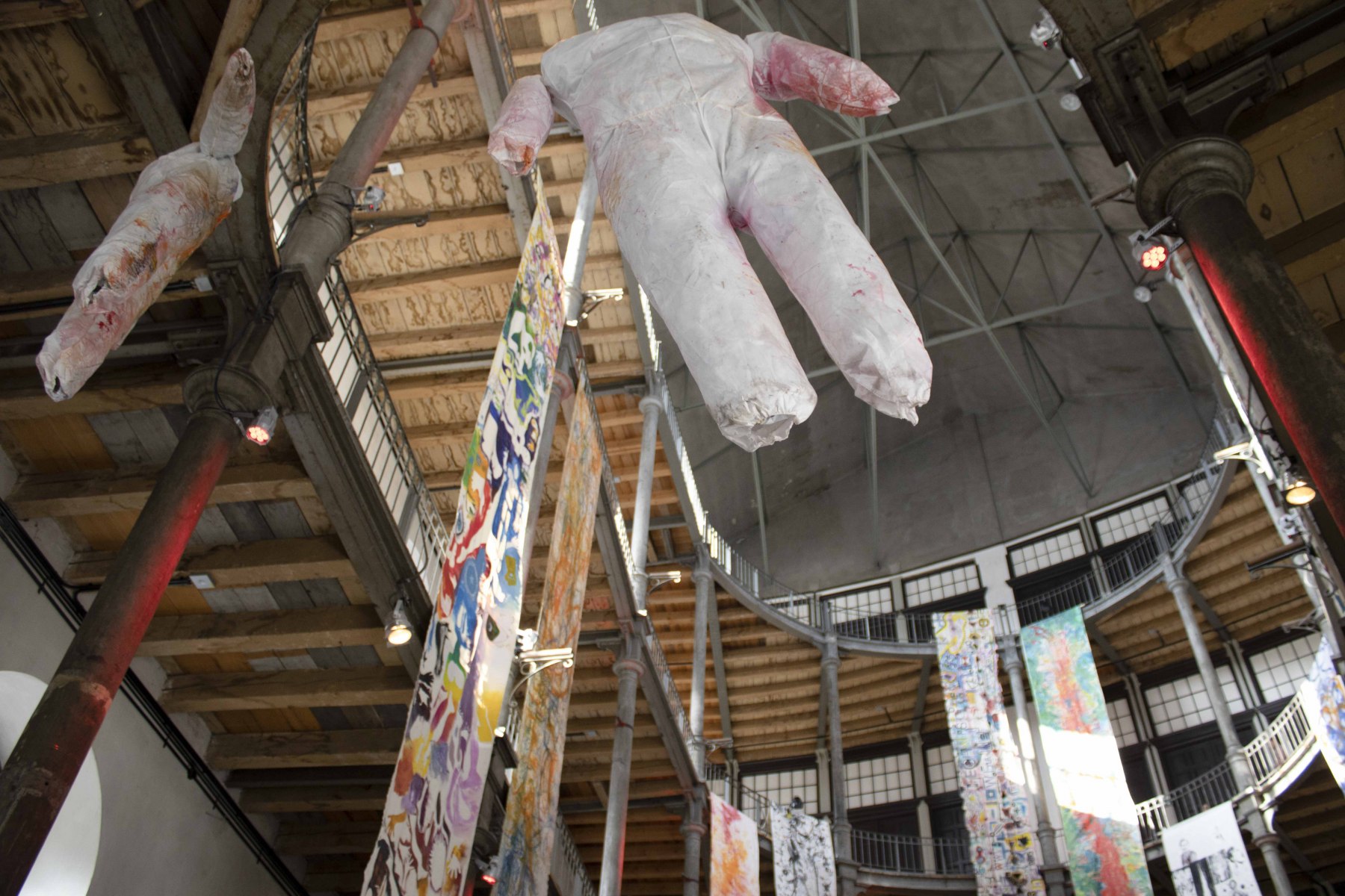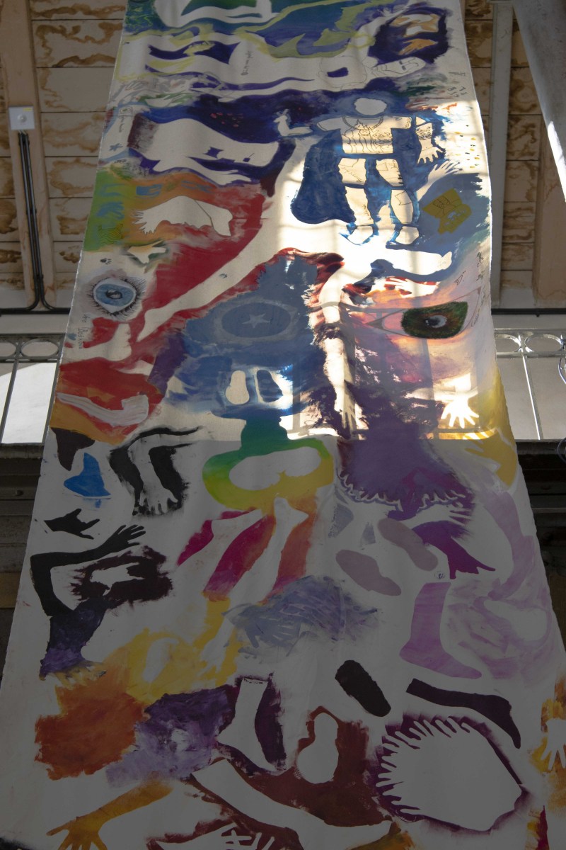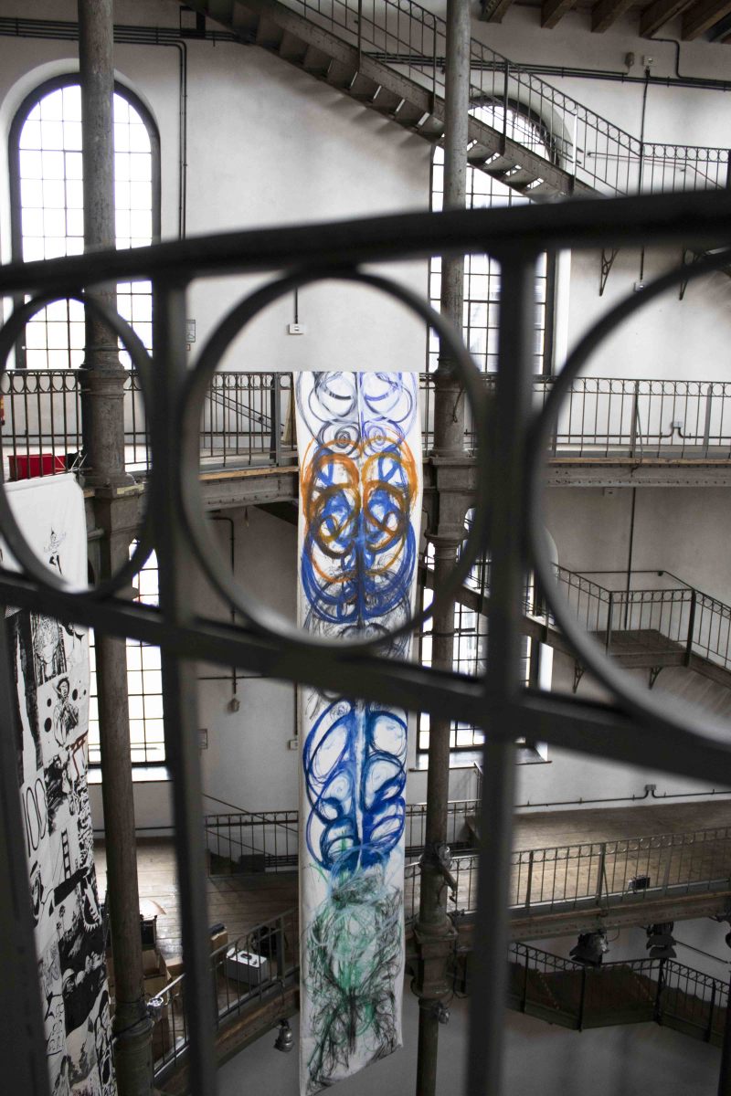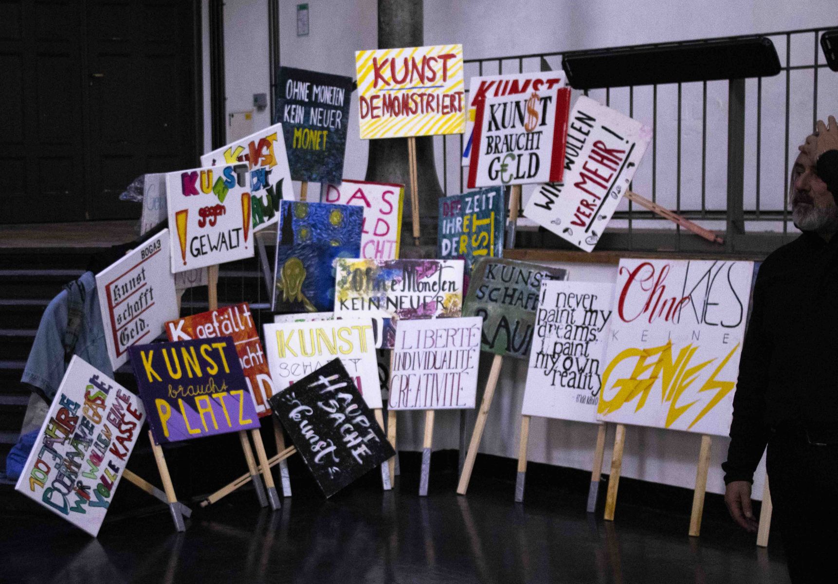 Farbmasse, vielleicht so dick wie Joghurt; Stifte, die den Klecks lebendig werden lassen; Ölkreide, deren Pigmente das Papier verlassen; Linien, die trennen und zusammenfassen; Drucke, die Form und Nichtform wiederholen; die Kraft der Kunstaktion, selbst ohne Worte spürbar. Unterschiedliche Materialien und Techniken – reichliche Spuren der Kunst auf neun Leinwandbahnen.